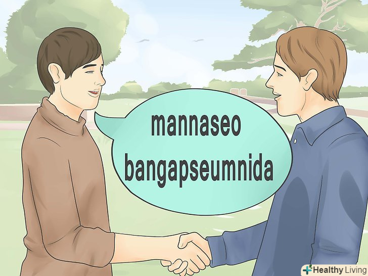 Говорите «маннасо пангапсымнида» при зустрічі з незнайомими людьми. на хангилі маннасо пангапсимніда пишеться як 만나서 반갑습니다. Вимовляється:»ман-на-со пан-гап-сим-ні-так".- Цей вислів означає»радий зустрічі з вами".