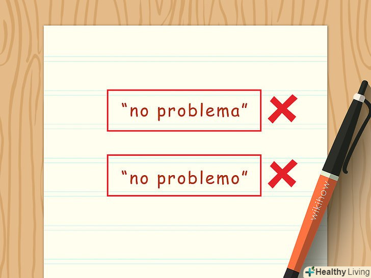 Не кажіть " no problema "або ще гірше"no problemo". " No problema "є граматично неправильним способом сказати" no hay problema", хоча така практика стає все більш поширеною серед іспаномовних жителів США.- Фраза "no problemo" використовується жителями Північної Америки, які розмовляють англійською мовою, вона є прикладом псевдо-іспанської мови і не повинна використовуватися, якщо ви розмовляєте іспанською.[2]