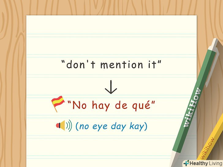Використовуйте і інші фрази.як і в англійській мові, в іспанському існує багато варіантів того, як можна сказати "немає проблем". Який з них буде найбільш підходящим саме у вашій ситуації, залежить від контексту. Ось деякі найбільш поширені альтернативні фрази:- No hay de qué: вимовляється як але АІ Дей Каї. Цю фразу найкраще використовувати після того, як хтось подякував вам. Її можна перекласти як "завжди будь ласка" або "не варто подяки".[3]