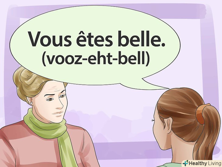 Використовуйте більш ввічливу формуvous êtes belle коли розмовляєте зі жінками старшого віку, зі знаменитостями, з людьми, що перевершують вас за рангом, у всіх тих випадках, коли ви говорите людині замість ти - ви. Vous це формальна версія займенника tu, і повинна правильно вживатися в розмові. Немає строгих граматичних правил, коли ви повинні вживати ви, спирайтеся на свої знання етикету, особливо якщо ви можете звернутися до жінки пані в російській мові, або Ms. або Mrs. в англійській.- Вимовляєте це так:ву зет бель.