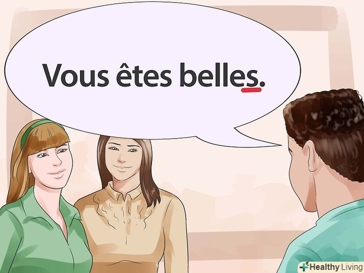 Якщо ви розмовляєте з кількома жінками, скажіть їм, що вони красиві, так: Vous êtes belles. це множинна форма попередньої фрази, але перекладається вона так само. Ви не можете просто додати закінчення s до belles, необхідно використовувати і множинну форму займенника ви з допоміжним дієсловом -- Vous êtes.- Вимовляєте це так:ву зет бель.