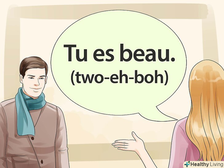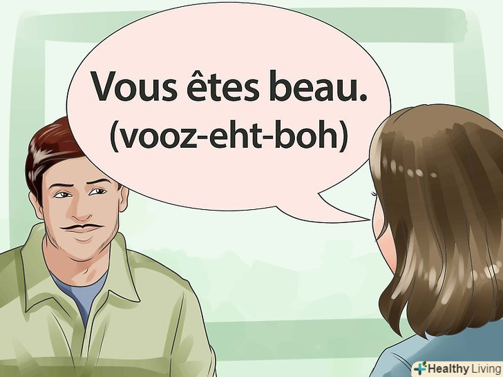 Використовуйте більш ввічливу формуvous êtes beau, коли розмовляєте з людьми старшого віку, зі знаменитостями, з людьми, що перевершують вас за рангом, у всіх тих випадках, коли ви говорите людині замість ти - ви. Vous це формальна версія займенника tu, і повинна правильно вживатися в розмові. Немає строгих граматичних правил, коли ви повинні вживати ви, спирайтеся на свої знання етикету, особливо якщо ви можете звернутися до людини Пан в російській мові або Mr. в англійській.- Вимовляєте це так:ву зет бо. Буква s не вимовляється.
