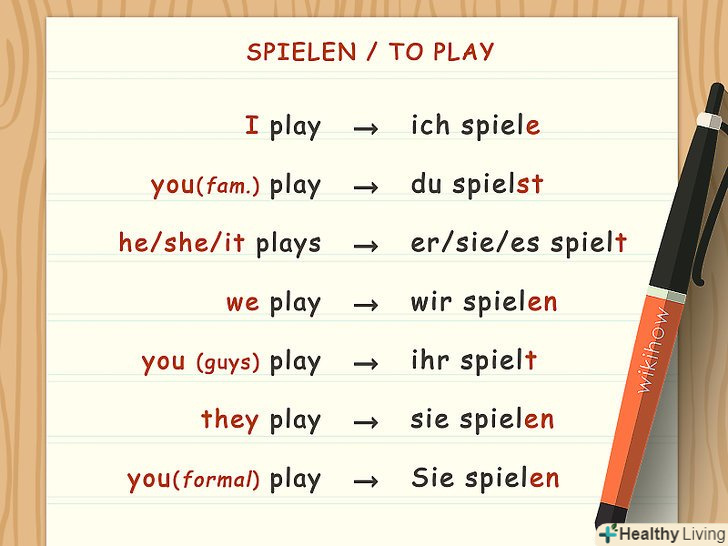 Відмінювання дієслів. у німецькій мові досить розвинена дієслівна парадигма, що враховує час, заставу, рід і т.д. на щастя, граматика німецької мови в цьому сенсі містить трохи винятків, а тому запам'ятати її буде просто.- Наприклад, виразний спосіб теперішнього часу характеризується закінченнями-e (1л., од. ч.),- st (2л., од. ч.),- en (3л., од. ч.),- en (1л., мн.ч.), - t (2л., мн.ч.), - en (3л., мн.ч.).