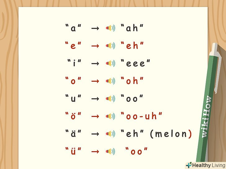 Вивчіть вимову голосних. голосні-це, мабуть, і є те саме, що визначає різницю в звучанні тієї чи іншої мови. Якщо вимовляти голосні правильно, то вас будуть розуміти якщо не всі, то багато носіїв мови. До слова, в німецькому, на відміну від англійської, є на цілих 3 голосних більше.- A-звучить як російська " а "