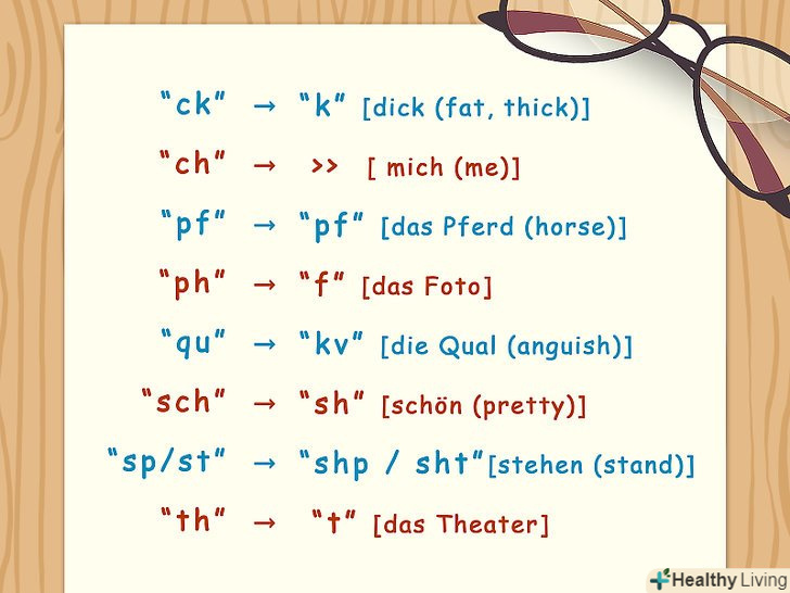Вивчіть дифтонги і складові звуки. як і в англійській, в німецькій мові є букви, які, коли пишуться поруч один з одним, вимовляються не так, як вимовлялися б, будь вони записані окремо. Ці комбінації Треба знати " в обличчя”:- Au-звучить як " ау "