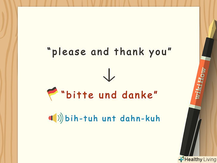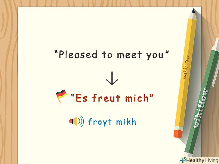 Вивчіть прості фрази.кілька важливих фраз вивчити треба обов'язково, так як вони будуть більш ніж корисні в щоденному спілкуванні, а також дадуть вам ще одну можливість попрацювати над вимовою.- Привіт-найпростіший варіант це"Hallo". Доброго ранку- " guten morgen "(формально) або" morgen " (менш формально). Добрий день, відповідно, "guten tag "і"tag".
