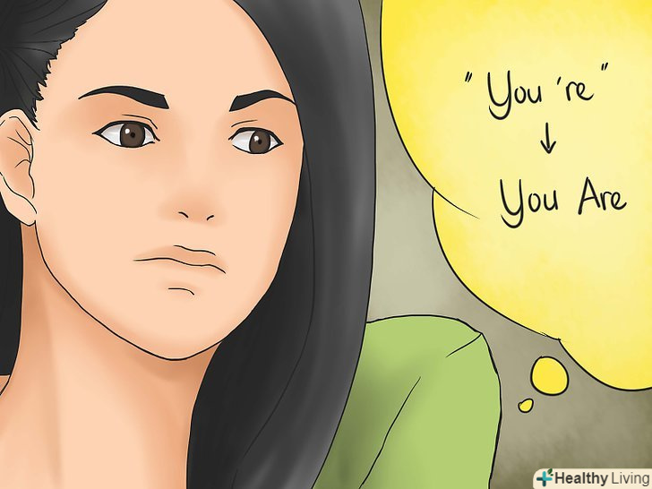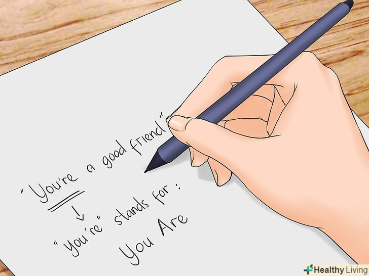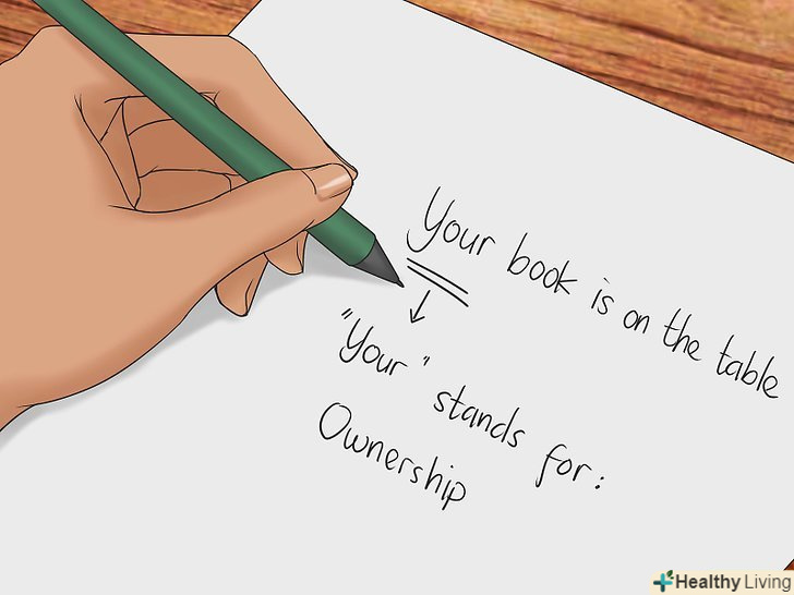 Придумайте мнемонічний вираз, щоб було простіше розрізняти слова.Мнемоніка-це набір прийомів, які допомагають щось запам'ятовувати. І вона може виявитися корисною, коли ви будете запам'ятовувати різницю між you're і your. Такі елементи, як аналогія та жива уява, як правило, є ефективними мнемонічними інструментами.- Зверніть увагу на пропозицію « " If you're writing ityou're, you're writing it right "(якщо ви пишете you're, ви пишете це правильно). Ви щось робите, коли пишете, тому скорочена формаyou're вірна .