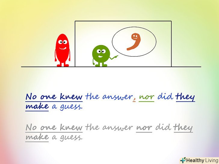 Використовуйте кому, коли" nor " відокремлює головне речення.[5] коли" nor " відокремлює підрядне речення, то кома не обов'язкова. Крім того, не обов'язкова вона і тоді, коли "nor" використовується лише для вказівки на зв'язок між двома іменниками. Проте, якщо цим словом відділяється головне речення, то кома потрібна.- Підрядне речення-ця та частина пропозиції, яка без головного речення неповноцінна і незрозуміла. Головне речення - це таке, в якому є граматичне ядро (підмет+присудок), яке може бути окремим і самостійним саме по собі.