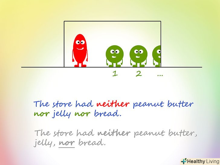 - Неправильний приклад: "the store had neither peanut butter, jelly, nor bread."