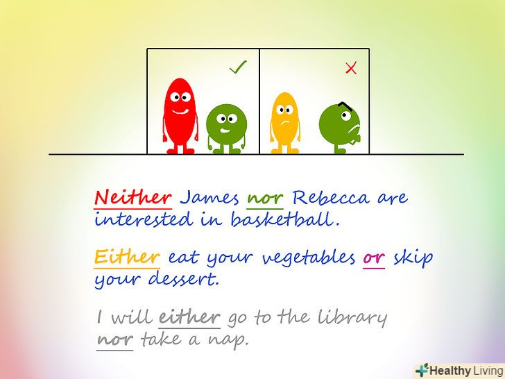 Використовувати" nor "разом з" either " не можна.нехай навіть "either" і "neither" використовуються за аналогічною схемою, у "either" визначення позитивне, а у "neither" - негативне. Відповідно, негативне " neither "встає в пару з негативним" nor", а позитивне" either "- з позитивним " or.”- Правило: "neither" завжди йде в парі з " nor," "either" завжди йде в парі з " or.”