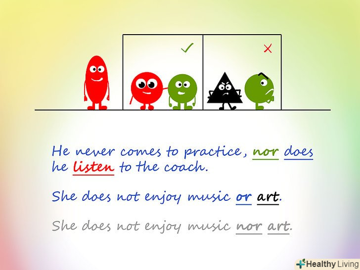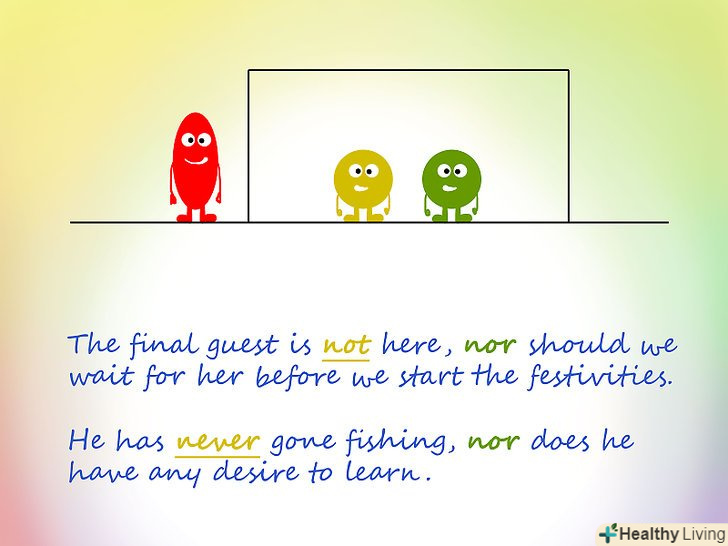 У списку можна використовувати "nor" кілька разів.як правило, конструкція neither / nor використовується для вказівки на негативний, негативний зв'язок між об'єктами або діями. Можна використовувати "nor", коли мова заходить про більш ніж двох об'єктах або діях, але тоді доведеться ставити" nor " після кожного пункту списку.[1]- Врахуйте, що" neither "може використовуватися всього раз, причому завжди, навіть якщо" nor " ви сказали 10, 100 або навіть більше разів.