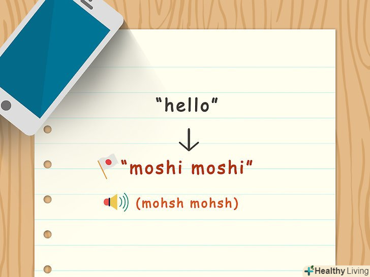 На телефонний дзвінок відповідайте фразою "Мосі Мосі". [3] це еквівалент слову "алло".- Використовуйте це привітання і коли дзвонять по телефону, і коли дзвонять вам.Мосі Мосі більше підходить для телефонних розмов, ніж коннітіва.