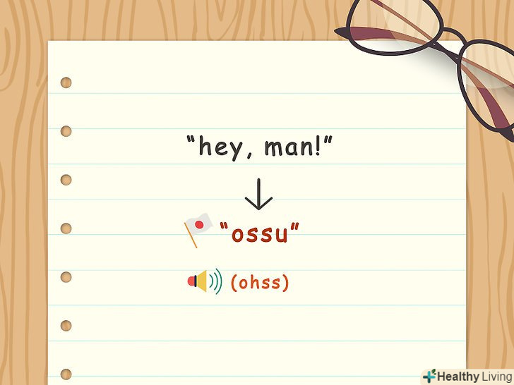 Близькі друзі чоловіка для привітання можуть використовувати "оссу".[4] це дуже неформальне привітання, його варто використовувати тільки серед чоловіків одного віку.- Дівчата або друзі різної статі зазвичай не вітають так один одного.
