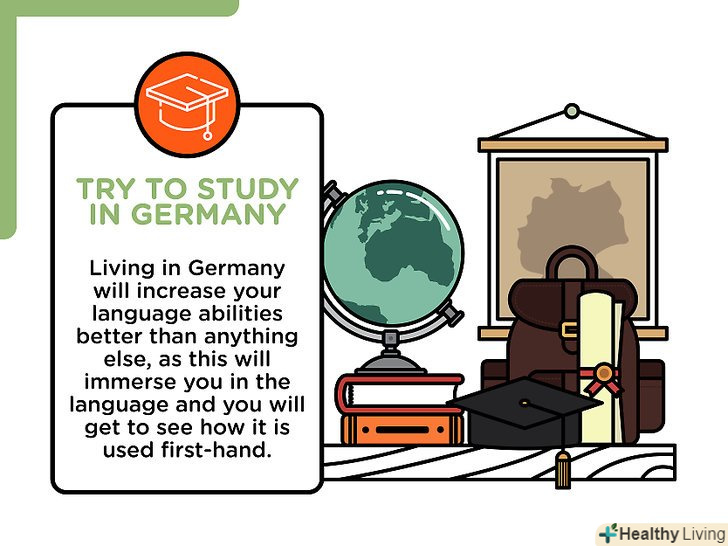 Спробуйте повчитися в Німеччині. Німецький уряд всебічно заохочує культурний обмін. Ви відкриєте для себе величезну кількість можливостей для навчання в Німеччині. Життя в Німеччині поліпшить вашу мову краще, ніж що б то не було, тому що Ви поринете в мовне середовище і будете бачити, як він застосовується на практиці.- Ви можете потрапити до Німеччини за програмою обміну вашої школи або Університету або можете подати документи на вступ до школи або університету в Німеччині. Вам буде видана студентська віза, яка дозволить перебувати в країні, а плата за навчання буде менше, ніж у багатьох інших місцях. Ви також замість школи можете підшукати собі роботу. Якщо ви досить молоді, то можете навіть працювати нянею або допомагати по господарству. Англомовні няні в Німеччині дуже затребувані.