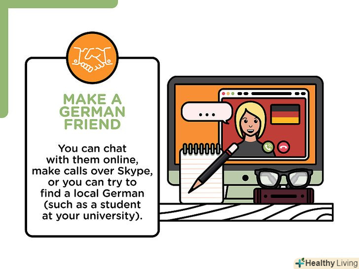 Заведіть дружбу з німцем.Подружившись з німцем, у вас буде можливість тренувати свою німецьку, запитати Як правильно вимовлятися слова або вживається граматика, вивчити нові слова, а також познайомитися з іншою культурою. Ви можете листуватися з ними в онлайні, дзвонити через Skype або спробувати знайти місцевих німців (студенти з обміну у вашому університеті).
