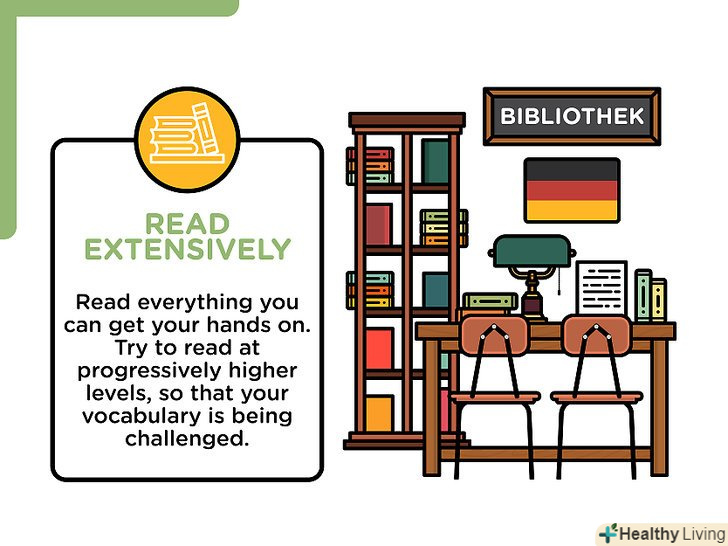 Читайте якомога більше.Читайте все, що попадеться під руку. Намагайтеся читати тексти складніше, щоб розвивати свій словниковий запас. Ви можете читати все що завгодно, але краще вибирайте для читання тексти з правильною граматикою і правописом. Це допоможе вам правильно вивчити мову.- Можете читати в режимі онлайн німецькі газети і журнали. Наприклад, Der Zeit, Frankfurter Rundschau або Der Spiegel (вважається трохи легше для читання, ніж газети).