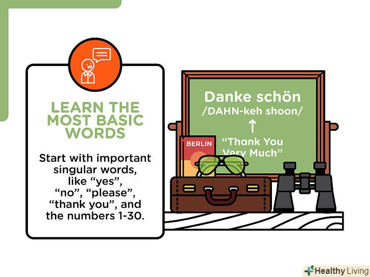Вивчіть основну лексику.Запам'ятайте основну лексику, щоб у вас була база знань, до якої Ви будете додавати вивчені пізніше дієслова, іменники та прикметники. Перед тим як відправитися в Німеччину або заговорити з німцем, важливо вивчити основні слова і вирази.- Почніть з найважливіших простих слів, таких як «так», «ні», «будь ласка», "спасибі" і цифр від 1 до 30.
