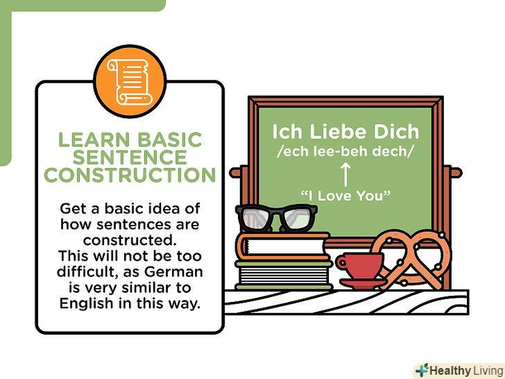 Навчіться складати прості речення.вивчіть основний принцип побудови речення. Це не буде особливо складно, так як в цьому плані німецький дуже схожий на англійську. Є деякі відмінності. Деякі з них ви вивчите на початковому етапі, а деякі пізніше.- Німці, в общем-то, зможуть зрозуміти, що ви намагаєтеся сказати, навіть якщо у вас буде неправильний порядок слів. Для того щоб вас зрозуміли, набагато важливіше вимова. Так що не особливо турбуйтеся через граматики.