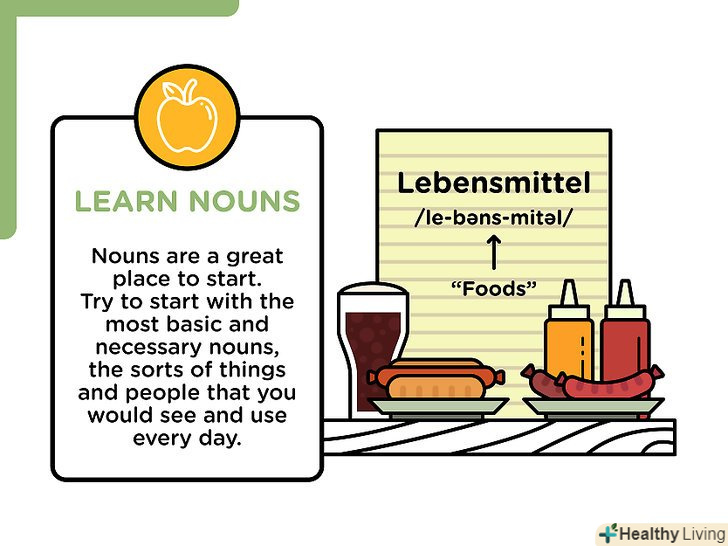- Знайдіть список найпоширеніших іменників, дієслів і прикметників німецької мови. Хорошим початком буде запам'ятати всі ці слова. Ви можете спробувати пошукати найпоширеніші слова англійської і подивитися німецькі еквіваленти.