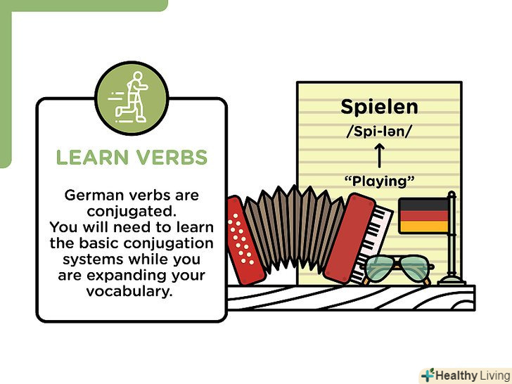 Вчіть дієслова.вам також захочеться вивчити основні дієслова. Це допоможе вам отримати толк від усіх тих іменників, які ви запам'ятали! Дієслова в німецькій мові відмінюються. Розширюючи свій запас дієслів, вам доведеться вивчити систему відмінювання дієслів.- Перед тим, як вчити складні дієслова, запам'ятайте найосновніші. Бігти, йти, стрибати, зупинитися, впасти, бути, мати, говорити, робити, отримувати і т.д. для початку ці слова будуть найкорисніше. Їх легше запам'ятати і використовувати, ніж складні дієслова.