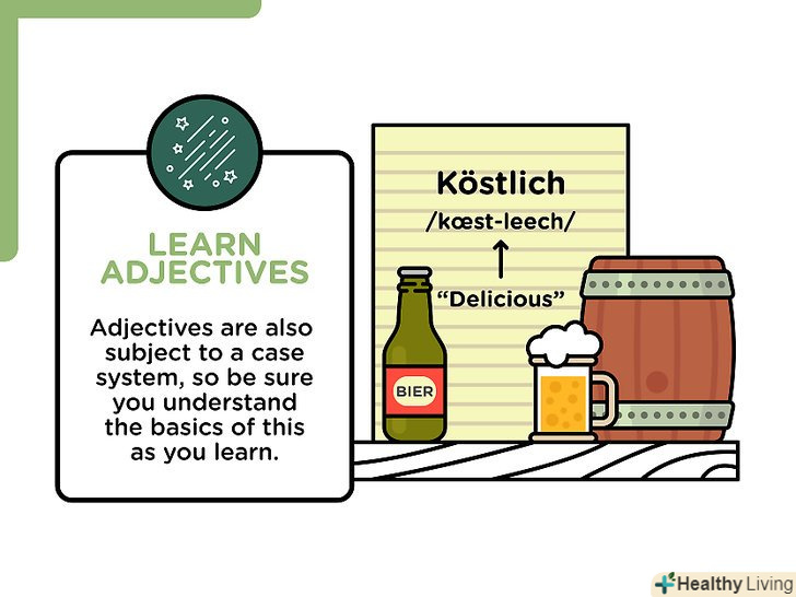 Вчіть іменники.як тільки ви запам'ятаєте базу слів, яка дозволить вам говорити німецькою, вам захочеться знати більше слів. Найкраще почати з іменників. Спробуйте почати з самих основних і потрібних слів, таких, які використовують в повсякденному житті.- Іменники змінюються за родом і за відмінками. Розширюючи свій словниковий запас, запам'ятовуйте, як ці категорії змінюють слово.