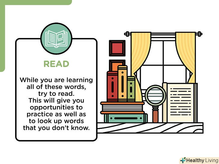 Читайте.Пробуйте читати, поки вчите всі ці нові слова. Так ви зможете не тільки тренуватися, але і шукати нові незнайомі слова. Читайте найпростіші книги, наприклад, дитячі казки. На ранньому рівні вам буде найлегше зрозуміти казки.