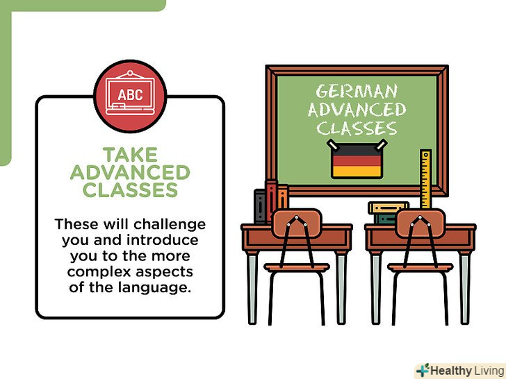 Відвідуйте уроки для учнів з просунутим рівнем мови.Так як Ваші знання стануть більш глибокими, то вам неодмінно захочеться, щоб уроки відповідали рівню, який ви досягли. Це стане для вас новим викликом. Ви ознайомитеся з більш складними аспектами мови. Поглиблені курси доступні в місцевих коледжах та університетах. Ви також можете замовити онлайн курс такого авторитетного університету, як Інститут Гете.