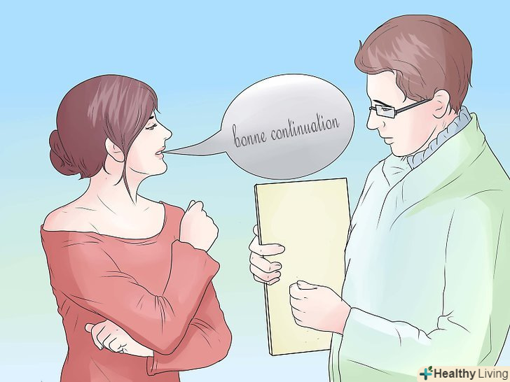 Використовуйте "Bonne continuation" при короткій зустрічі.[5] ця фраза, як правило, використовується тільки для того, щоб попрощатися з людиною, з якою ви коротко зустрілися і, швидше за все, більше ніколи не побачитеся.- Фраза може бути перекладена "удачі"або" хорошого продовження".