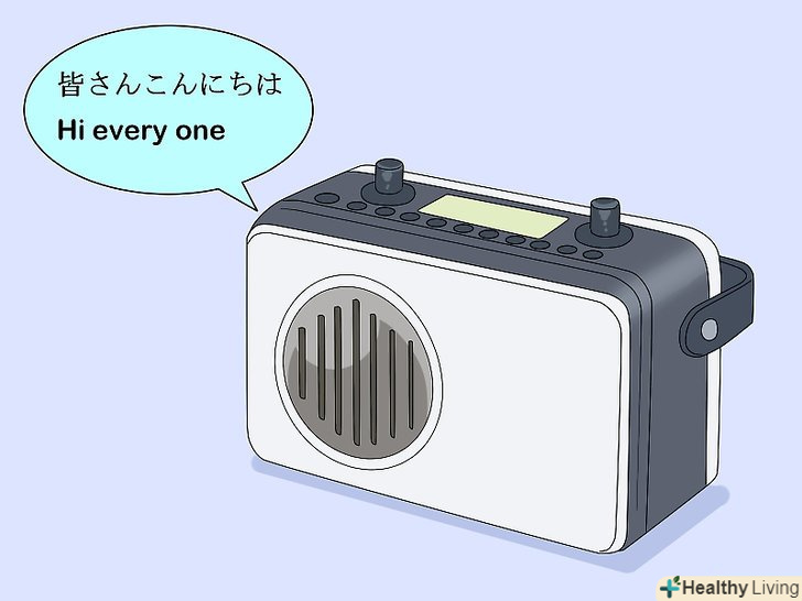 Слухайте Японське радіо.так само як і перегляд телепередач і фільмів, прослуховування японського радіо послужить відмінним ресурсом для знайомства з новими словами і практикою аудіювання. Знайдіть Тексти японських пісень і спробуйте підспівувати їм. Або пошукайте японське розмовне радіо.[14]- Японські подкасти або подкасти з вивченням японської мови теж будуть відмінними ресурсами.