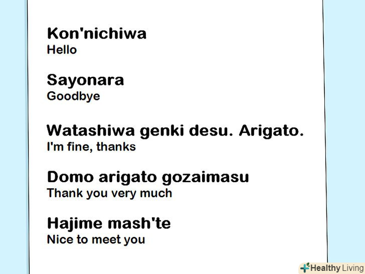 Вивчіть кілька основних виразів.так ви зможете почати практикувати мову, і, можливо, це дозволить вам насолодитися невимушеним спілкуванням з носієм японської мови. Незважаючи на те, що не слід покладатися на кірідзі, її використання може послужити хорошим трампліном для вивчення основних виразів.[6]- Привіт-коннітіва