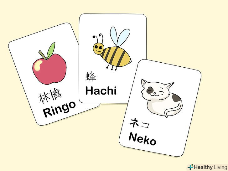 Використовуйте дидактичні картки.їх можна купити або зробити вдома самостійно. Потім можна практикувати мову за допомогою них різними способами. Дидактичні картки є відмінним способом зміцнити свій словниковий запас у всіх трьох мовних системах (хірагана, кандзі або катакана).[7]- Розмістіть картки по дому і підписуйте предмети їх японськими назвами.