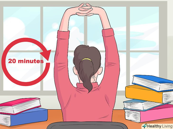 Робіть часті перерви.при виконанні домашніх завдань робіть короткі перерви приблизно кожні 20 хвилин. Встаньте, потягніться, пройдіться, дайте відпочинок очам і випийте склянку води. Короткі, підбадьорливі перерви краще, ніж довгий відпочинок, який відволікає або викликає сонливість.[2]- Встановіть таймер, щоб не забувати про перерви! Намагайтеся не виходити за тимчасові рамки. Не робіть перерву занадто рано.
