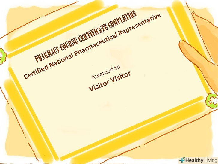 Отримати сертифікат Національного фармацевтичного представника, наданий Національною асоціацією фармацевтичних представників.компанія НАФП розробила сертифіковане навчання Національного фармацевтичного представника, яке включає в себе все, що вам потрібно для того, щоб відокремити себе від усіх кандидатів. І хоча на сьогоднішній день в магазинах продаються книги для самостійного вивчення, вони не йдуть в порівняння з систематичним, спеціальним і кваліфікованим підходом надаються НАПФ. Коли кандидат повністю розгляне курс навчання, йому призначається іспит. Склавши іспит, кандидат буде нагороджений сертифікатом НФП.