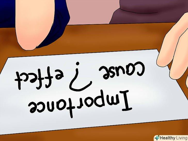 Намалюйте карту T. Це проста таблиця з двома колонками. В одній колонці ви пишіть причини, а в іншій слідства. Наприклад, ви можете написати:»йде дощ". Нехай ваша дитина подумає над слідством: стало брудно, виросли квіти, в школі позапланові канікули, пробки на дорогах. Напишіть ці наслідки в другій колонці.- Ви можете використовувати Т карти для того, щоб продемонструвати поняття причини і слідства в мові. Наприклад, ви пишете» йде дощ " зверху замість того, щоб написати в лівій колонці. У лівій колонці ви пишіть»стало брудно тому, що йде дощ". Такий спосіб вчить дитину двом основним формам причини і слідства: фраза «тому що» і слово «тому». Це також відтворює і саме поняття.