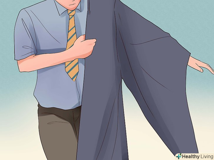 Повністю протягніть руки в рукави.незважаючи на розрізи по обидва боки мантії, руки не повинні потрапити в ці прорізи. Вони повинні увійти в рукава, а мантія – спадати вниз з плечей.[5]- У мантіях для магістрів і докторів бувають розрізи замість повноцінних рукавів. В такому випадку протягніть руки через них.