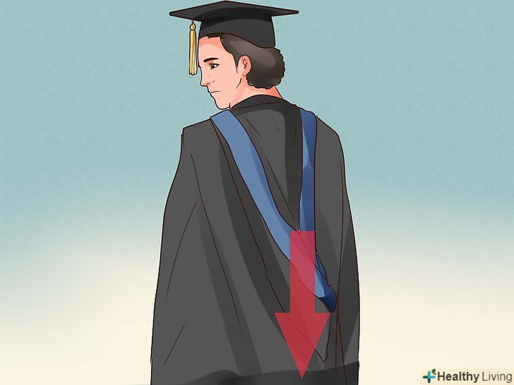 Потягніть мантію ззаду, щоб вона вирівнялася врівень з плечима.задня частина наряду повинна підтягнутися ближче до шиї.- Мантія може сповзати під час церемонії або поки ви будете чекати вручення диплома на сцені. Обов'язково перевіряйте, щоб вона сиділа на плечах рівно. Якщо мантія перекоситься або сповзе, підніміть її і потягніть вперед щоб вирівняти її перед виходом на сцену.