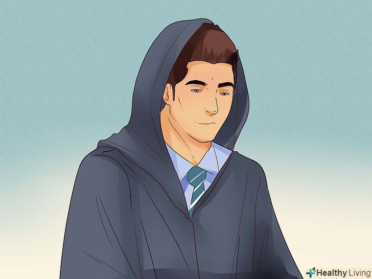Виверніть назовні атласну частину капюшона в області шиї.Можете попросити кого-небудь вам в цьому допомогти. На шиї повинна бути видна тонка кольорова лінія. Точно також злегка виверніть капюшон на спині, щоб кольорову лінію атласу було видно і там.[10]- Якщо капюшон буде перекошуватися або вивертатися, підколіть його до мантії англійськими шпильками.