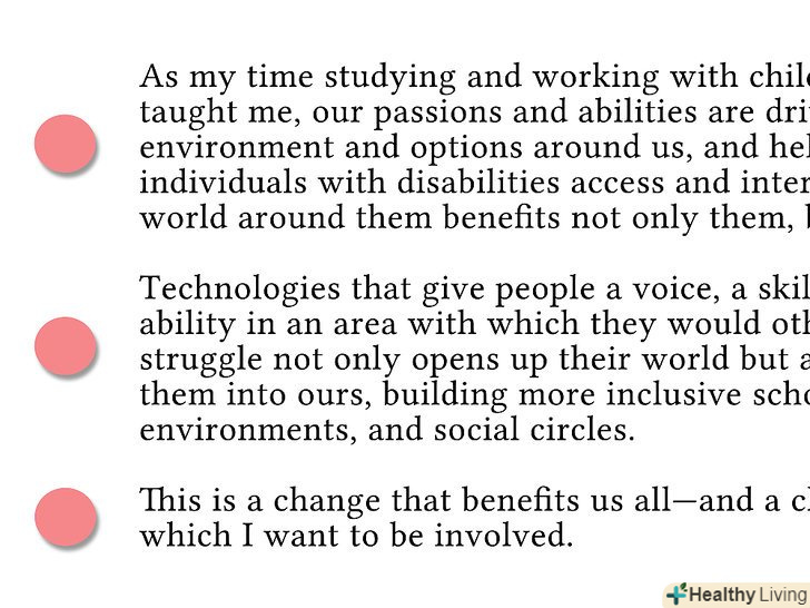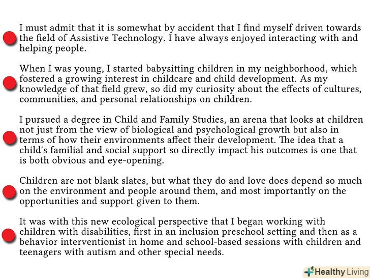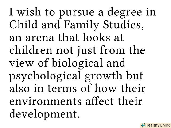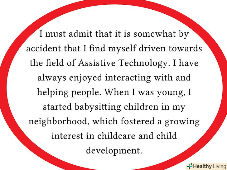 - Використовуйте короткі історії, щоб підкреслити ваші сильні сторони. Після того, як члени комісії прочитають кілька десятків заяв, всі вони починають бути схожими один на одного; деякі конкретні і цікаві подробиці можуть допомогти кандидату виділитися. Звичайно, це допомагає, якщо ці історії пов'язані з загальним пунктом, про який ви пишете в своїй заяві.