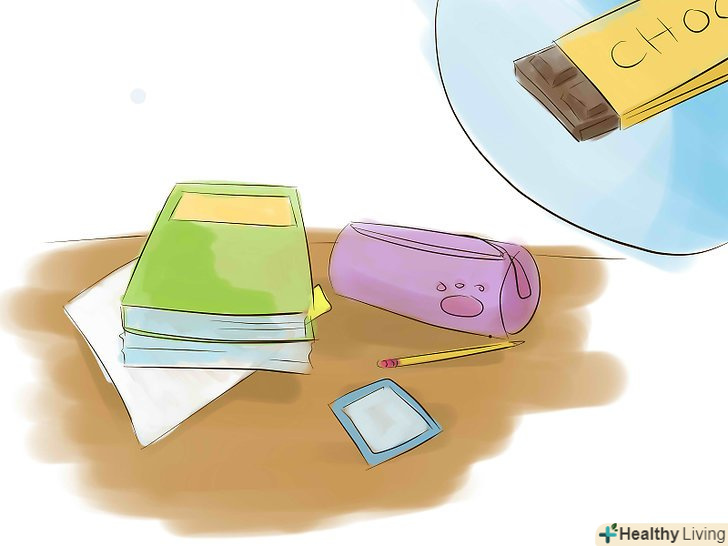 Зберіть всі ваші навчальні посібники (і не забудьте про солодощі).коли залишаєте кімнату в гуртожитку або будинок, переконайтеся, що взяли з собою все необхідне. Візьміть ваші конспекти, папки, Письмове приладдя та книги, але не забудьте також про не менш важливі речі: пляшку води, трохи грошей (про всяк випадок), навушники і що-небудь перекусити.