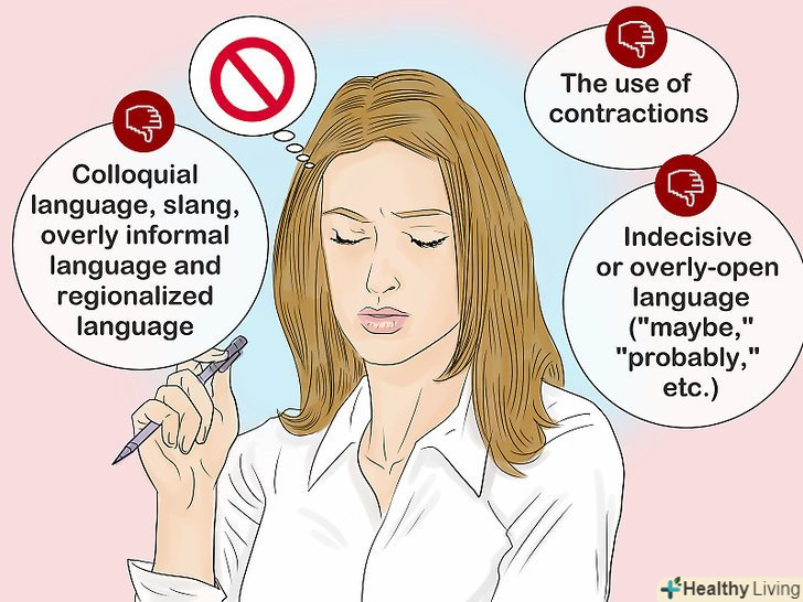 Уникайте певних типів мови. деякі типи мови не підходять для високого рівня наукової роботи. Уникайте їх з самого початку, і пізніше ви заощадите час на редагуванні, так як ваш науковий керівник, безсумнівно, попросить вас змінити або видалити ці фрагменти.- Розмовна мова, сленг, надмірно неформальна мова або діалект — це дуже поганий вибір для дисертації. Не використовуйте їх за будь-яких обставин.