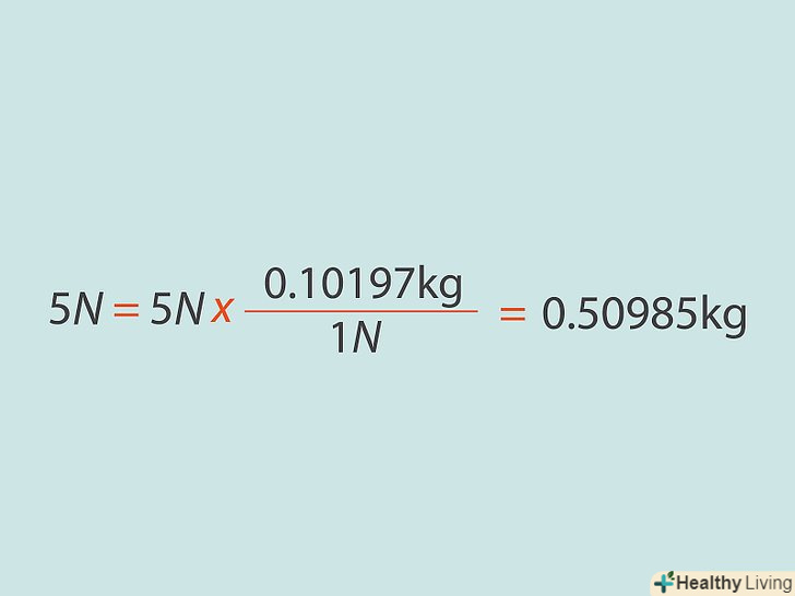 Перетворіть одиниці виміру.якщо коефіцієнт перетворення записаний вірно, просто помножте його на дане значення. Зверніть увагу, що значення в ньютонах множиться на дріб, в знаменнику якої теж знаходяться ньютони. Таким чином, ньютони скорочуються,а кілограм-сили залишаються.[2]- У нашому прикладі: