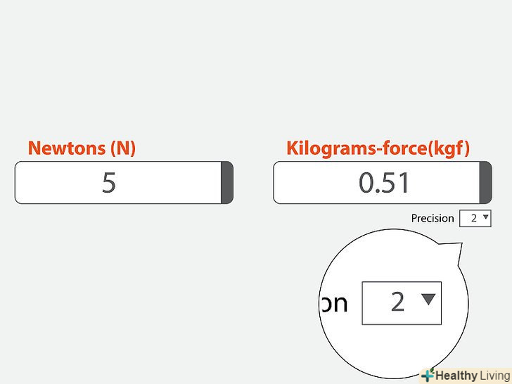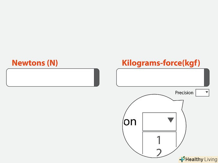 Задайте точність кінцевого значення (якщо потрібно). деякі калькулятори вважають з певною точністю, яка задана за замовчуванням, а ось на інших калькуляторах точність можна налаштувати – в цьому випадку вкажіть потрібний рівень точності і отриманий результат зміниться відповідно до вашим вибором.[5]- Наприклад, якщо на зазначеному Сайті точність задати як " 1 " і ввести число 10 (10 Н), результат перетворення буде дорівнює 1 кгс. Якщо рівень точності змінити на» 2", кінцеве значення зміниться на 1,02 кгс. Якщо рівень точності вказати як "5", перетворене значення перетвориться в 1,01972 кгс.