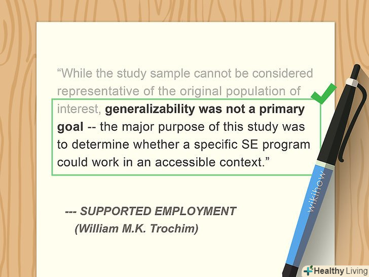 Оцініть, чи можна переносити або узагальнювати ваші результати.можливо, ви можете перенести ваші результати в інший контекст або узагальнити їх. У соціальних науках переносити результати зазвичай складно, особливо якщо ви використовували якісний підхід.[15]- Узагальнення зазвичай можна використовувати при кількісних дослідженнях. Якщо у вас є добре сформована вибірка, ви можете статистично застосувати отримані результати на більший масив даних, до якого належить ваша вибірка.
