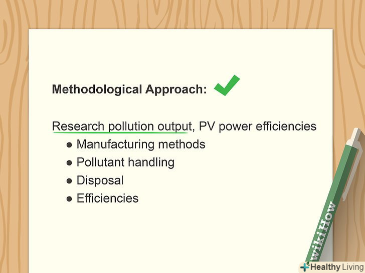 Оцініть інші методи, які ви могли б використовувати.у випадку, якщо ви використовуєте метод, який виглядає незвичайним для вашої теми, включіть у вашу роботу обговорення інших методів, які зазвичай використовуються в дослідженнях, подібних до Вашого. Поясніть, чому ви не стали їх використовувати.[11]- У деяких випадках досить просто вказати, що існує безліч досліджень, що використовують певний метод, але немає жодного, що використовує ваш метод, через що виникає пробіл в розумінні цієї проблеми.