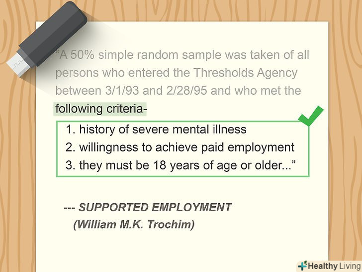 Поясніть вибір критеріїв відбору даних.якщо ви збираєте первинні дані, ви, швидше за все, встановите параметри відбору. Ясно вкажіть ці параметри і поясніть вашим читачам, чому ви встановили саме такі параметри і чому вони важливі для вашого дослідження.[8]- Якщо ви проводите соціологічне опитування, опишіть учасників вашого дослідження і вкажіть всі критерії включення і виключення, які ви використовували при формуванні групи учасників.