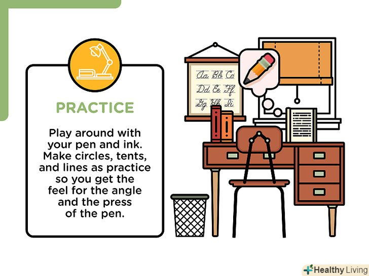 Практикуйтеся.вам, звичайно, необхідно тренувати ваш власний стиль письма, щоб до нього звикнути. Крім того, вам потрібно тренувати кут нахилу ручки і руху руки.- Поекспериментуйте з ручкою і папером. Намалюйте лінії, кола та інші фігури, щоб відчути кут і силу натискання на ручку.