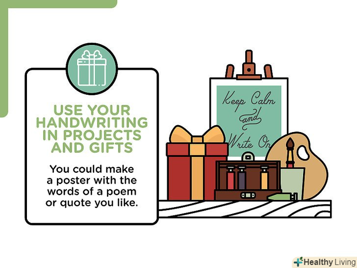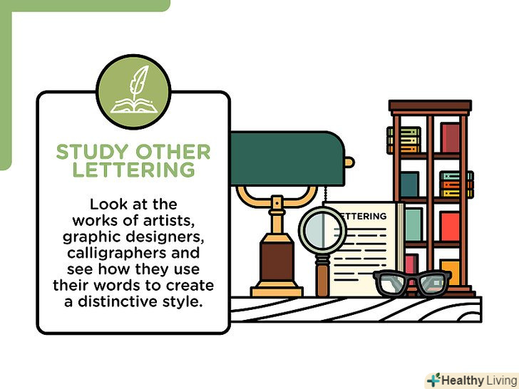 Оволодійте різними стилями письма.навчитися писати каліграфічному почерком або прописом — добре, але варто спробувати і інші види письма.[7]- Вивчіть роботи художників, графічних дизайнерів, каліграфів і подивіться, як вони створюють свій неповторний стиль письма.