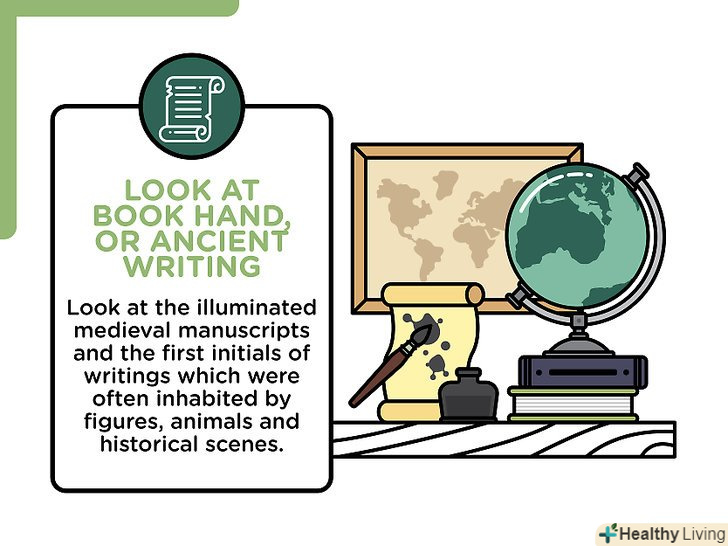 Вивчіть стародавнє письмо.наприклад, погляньте на Середньовічні рукописи і на перші літери рядків, які зазвичай були у формі тварин і історичних сцен.- У стародавніх рукописах можна знайти багато цікавих ідей для створення свого власного стилю письма. Вивчіть стародавні єгипетські ієрогліфічні або ієрогліфічні рукописи або Норвезькі руни.