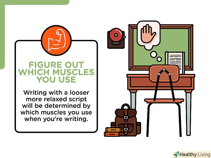 Визначте, які м'язи у вас задіяні при листі.вільний, м'який почерк визначається м'язами, використовуваними при письмі. Потрібно задіяти не тільки кисть і пальці. Гарний почерк вимагає роботи всієї руки і навіть плеча.[2]- Щоб це визначити, напишіть абзац звичайним почерком. Зверніть увагу на задіяні м'язи. Це допоможе вам зрозуміти, чи напружуєте ви тільки кисть або всю руку при вільній, м'якій манері письма.