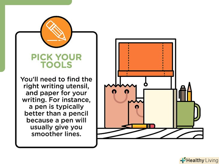 Виберіть собі приладдя для письма.вам необхідно знайти для себе відповідну ручку і папір для письма. Всі люди різні, але існують загальні поняття, з якими письмовим приладдям простіше виробити гарний почерк. Наприклад, ручка, як правило, краще олівця, тому що з нею виходять більш рівні лінії.[3]- Якісний папір( зазвичай дорожче звичайної), а не комп'ютерна, дозволить поліпшити ваш почерк, так як ви не зіткнетеся з плямами, краплями і протеклими чорнилом. Такий папір можна придбати в канцелярських магазинах.
